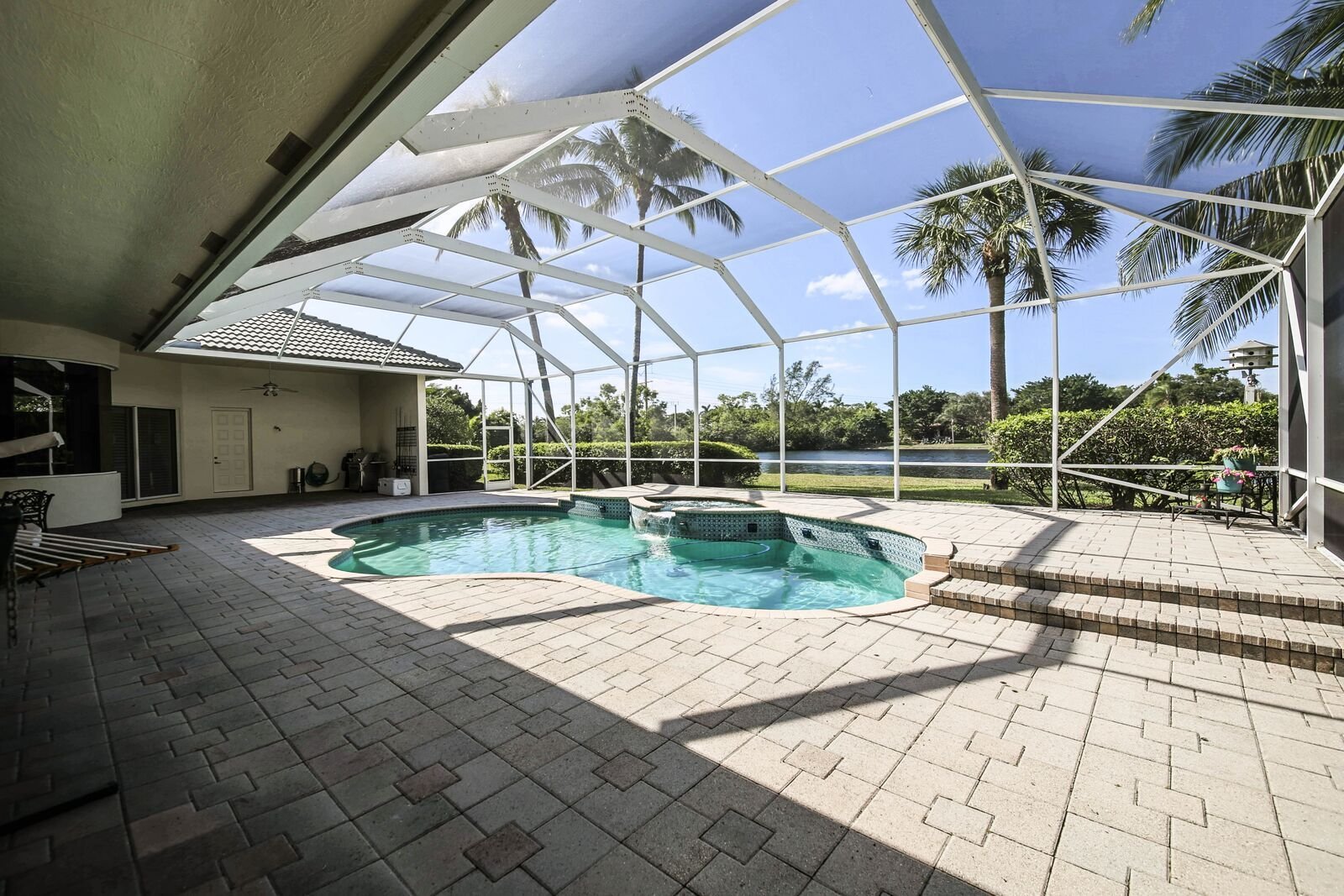 This luxurious and impeccably maintained 1+ acre estate with 5 bed and study/6th bedroom (no closet). Whispering Woods is in one of the most unique guard gated neighborhoods. Enjoy the spectacular sunsets overlooking the stocked lake. Fabulous home for entertaining with the expansive screened patio with pool and spa. Upgraded features include: marble floors, gourmet kitchen, wet bar, 8’ high interior doors, volume ceilings and luxurious master suite. Plenty of room to expand! Lots of yard for outdoor fun and games!